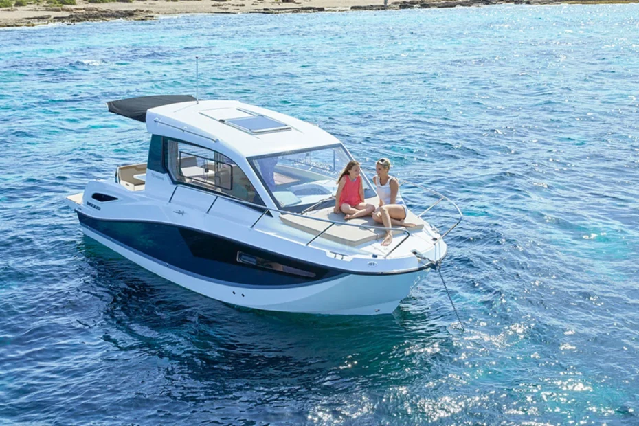 Este barco deportivo cabinado presenta una distribución interior que maximiza el uso del espacio sin renunciar al confort. En su cabina encontrarás una zona dinette que se transforma en cama adicional, una cama de proa amplia y un baño integrado para mayor privacidad y comodidad a bordo. Los materiales y acabados están pensados para crear un ambiente acogedor durante tus travesías, facilitando la convivencia familiar o con amigos. La bañera exterior se adapta con facilidad, transformándose de área de comedor a solárium generoso, ideal para descansar bajo el sol o socializar antes de partir.