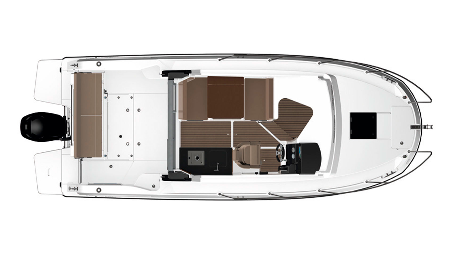 Equipada con motores fueraborda de hasta 300 CV, lo que le confiere un comportamiento dinámico y ágil en navegación, sin sacrificar eficiencia ni estabilidad.