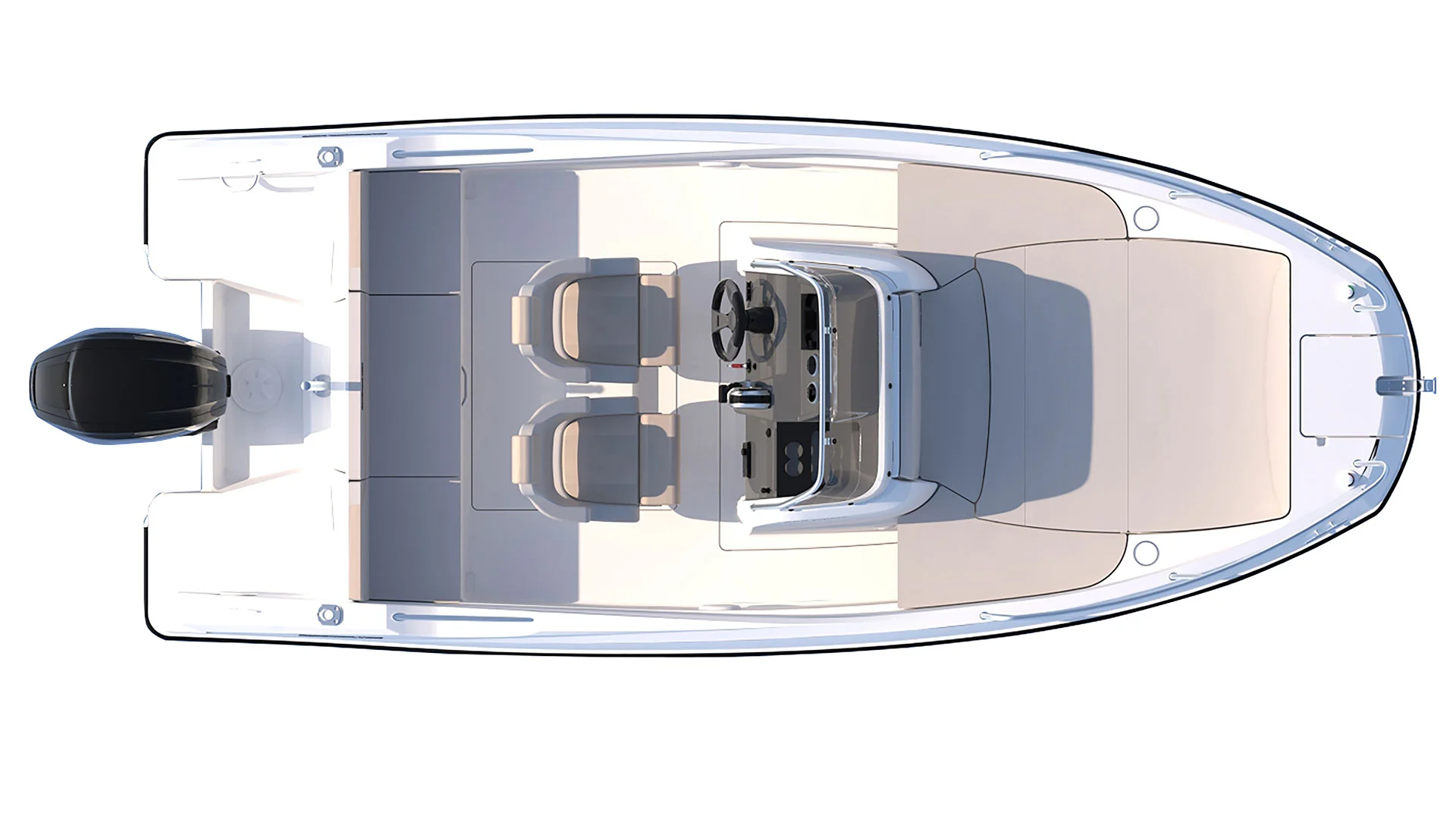 •Roldana de proa •Escalera de baño •Luces de navegación •Pozo de ancla •Bañera autovaciante •Cañeros •Plataformas de baño •Proa/parabrisas/rieles de cubierta en negro •Tacómetro/velocímetro analógico •Indicador de combustible •Indicador de trim •Banco de popa •Asiento patrón giratorio con base practicable •Asiento acompañante giratorio •Colchonetas de bañera •Espacio para estiba bajo el asiento de popa •Pre-instalación fueraborda •Sistema de batería •Bomba de achique eléctrica y manual •Dirección Hidráulica •Extintor incendio •Aplicación VesselView Mobile